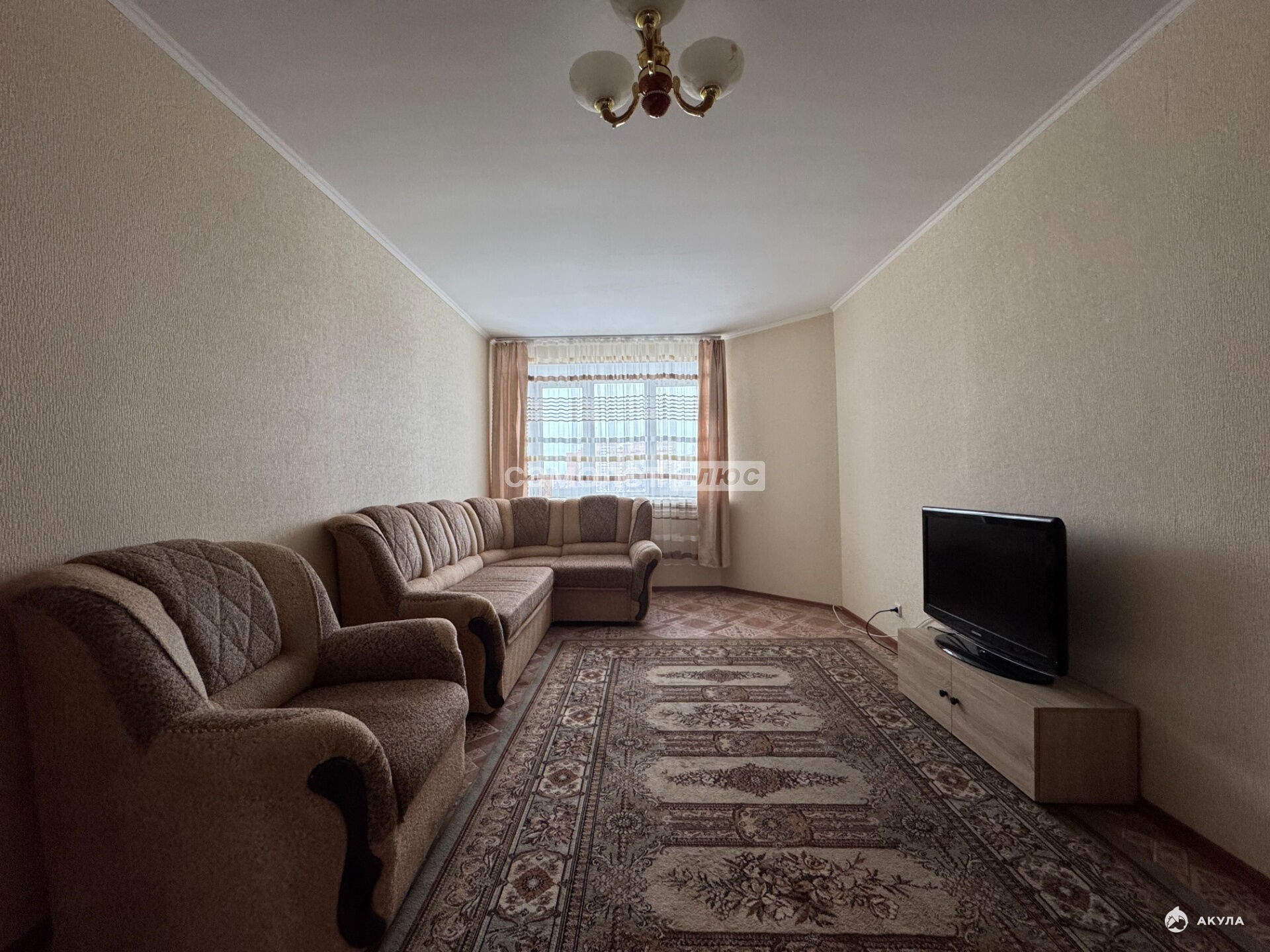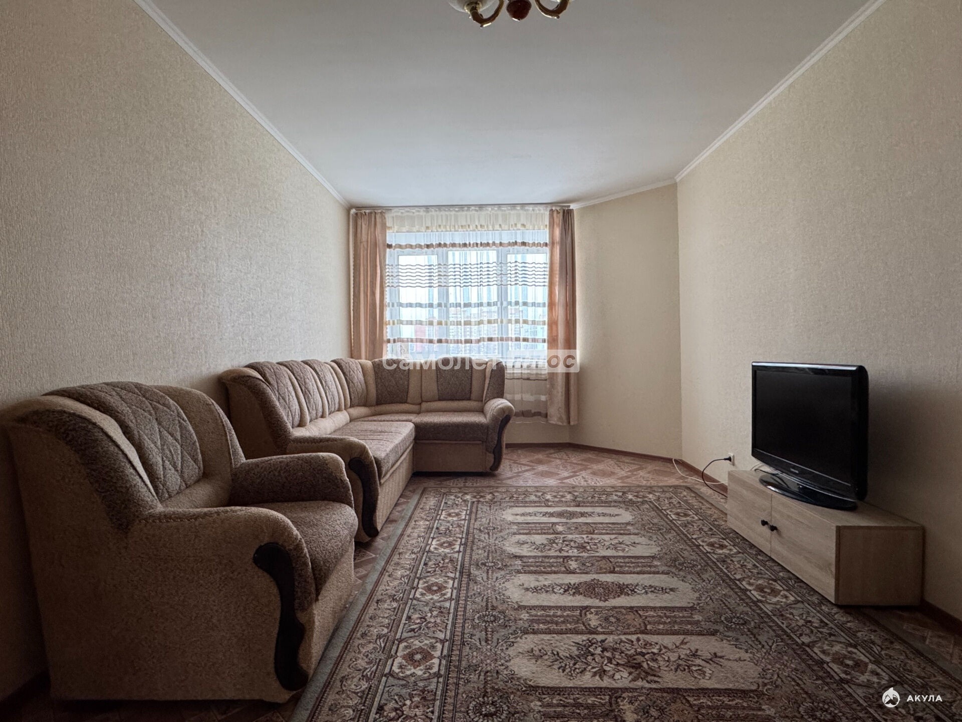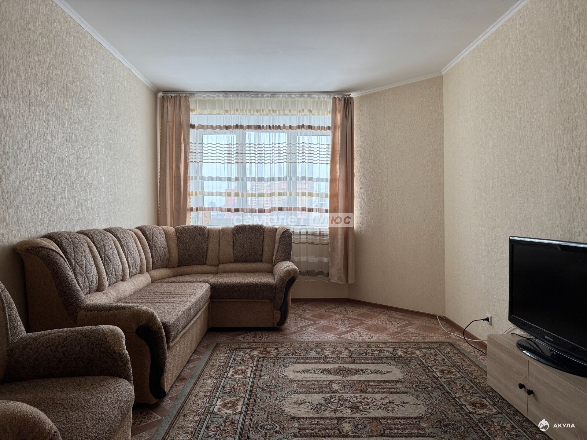 Состояние квартиры: . Просторная, светлая и полностью готовая к проживанию. Остается кухонный гарнитур, обеденный стол, холодильник, диван, стиральная машинка.