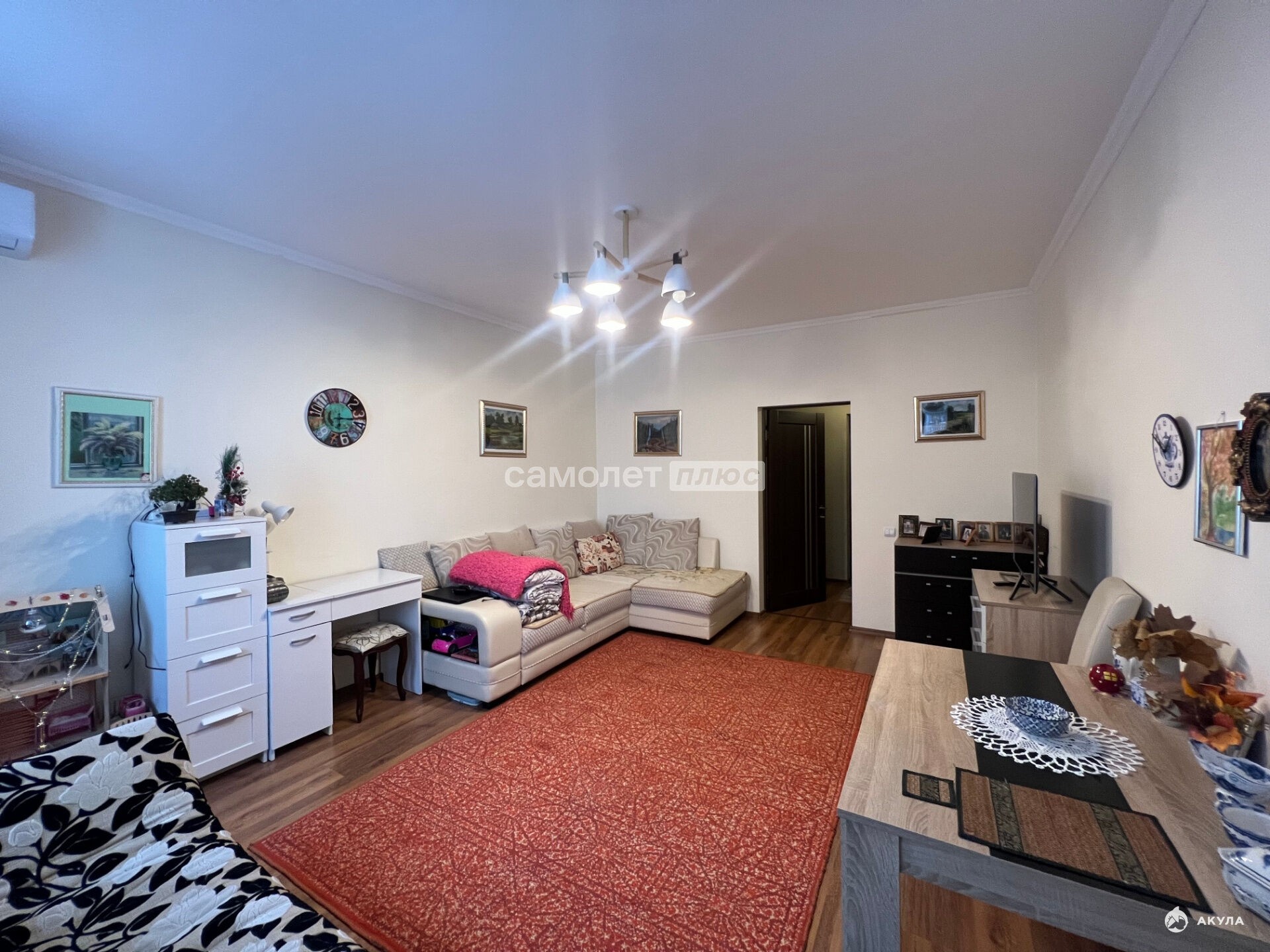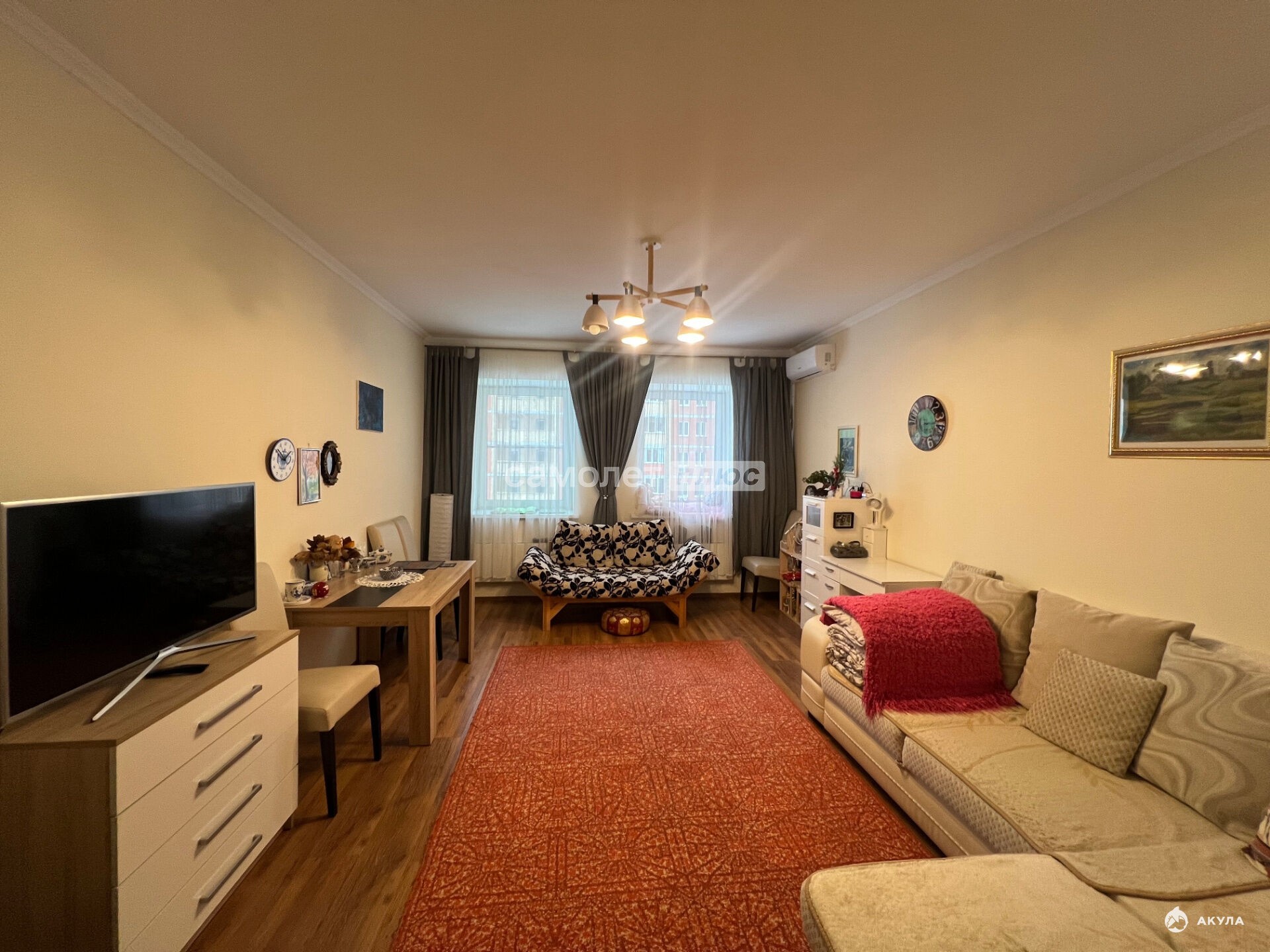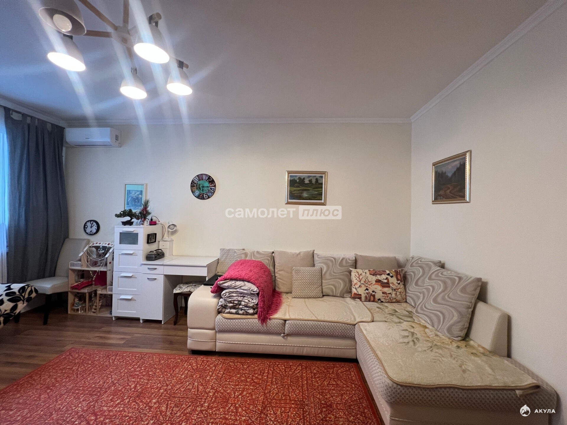 В квартире выполнен качественный ремонт: стены оформлены в светлых тонах, на полу ламинат, заменены окна, установлен кондиционер. Покупателю остается вместительный шкаф, удобный диван, кухонный гарнитур и стиральная машинка. Не угловая.