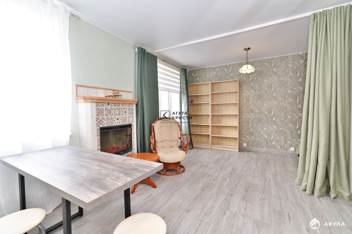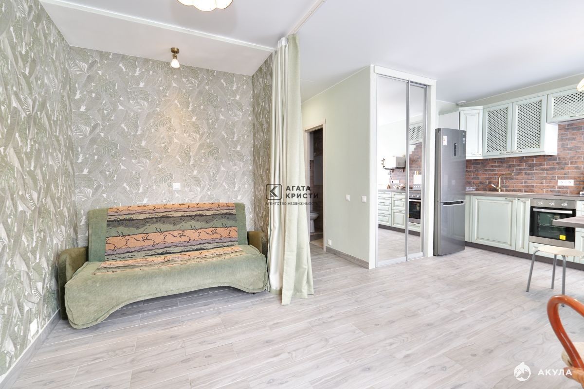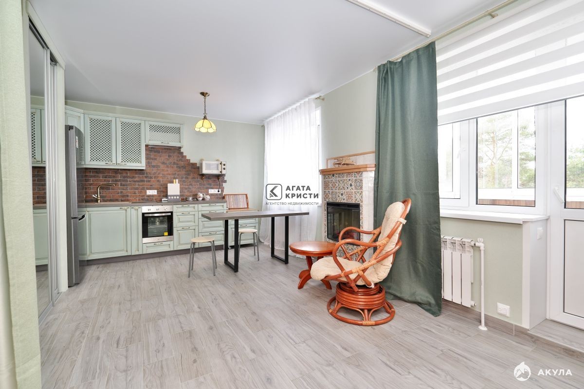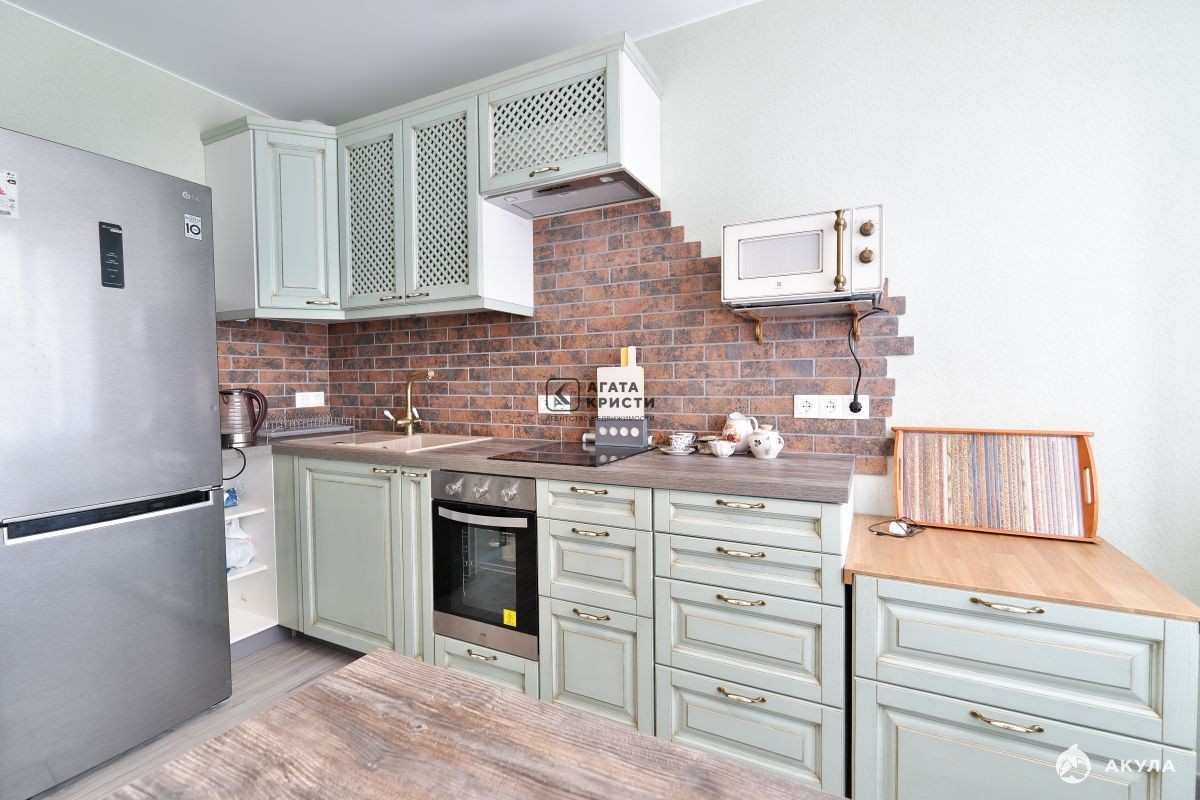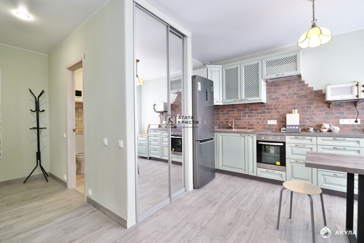 В квартире новая качественная дизайнерская отделка. Металлическая дверь, окна-стеклопакеты, на полах плитка с электроподогревом, на стенах декоративная штукатурка, обои. Есть зеркальные шкафы-купе, стильная кухонная мебель, холодильник, СВЧ-печь, духовка, электроплита, воздушный фильтр, вытяжка, обеденный стол с табуретами. Раскладной диван 160см. Электрокамин, ТВ, интернет, сушилка для белья. Санузел совмещенный, есть стиральная машина, накопительный водонагреватель, угловая ванна, умывальник с зеркалом, унитаз, шкаф с полками. Санузел снабжен поручнями для удобства маломобильных граждан.